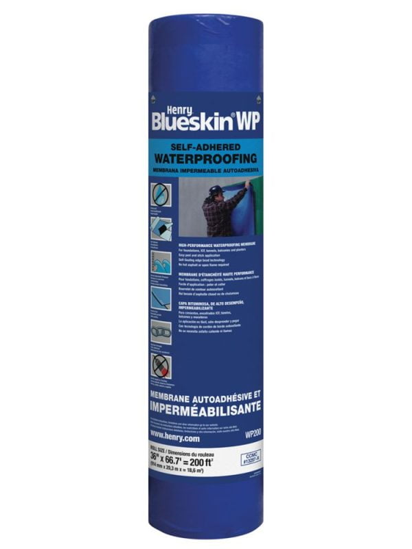 Blueskin® WP 200 is a self-adhering composite membrane consisting of an SBS rubberized asphalt compound, integrally laminated to a blue, high-density polyethylene film. The membrane is specifically designed for self-adhering to a prepared substrate, and provides a high-performance waterproofing barrier.