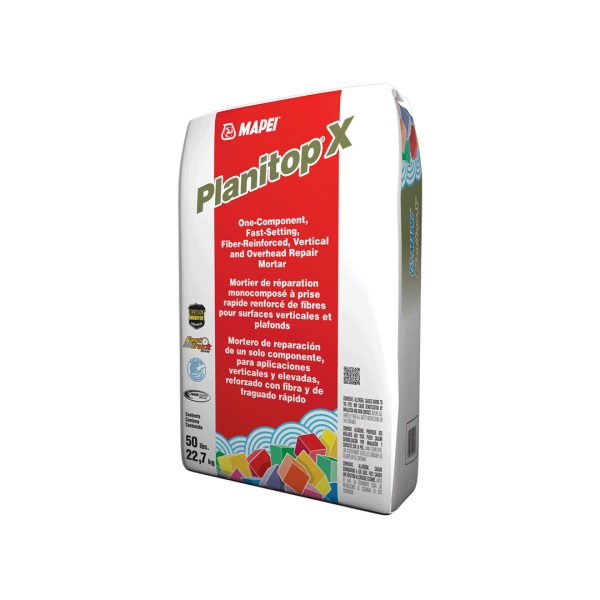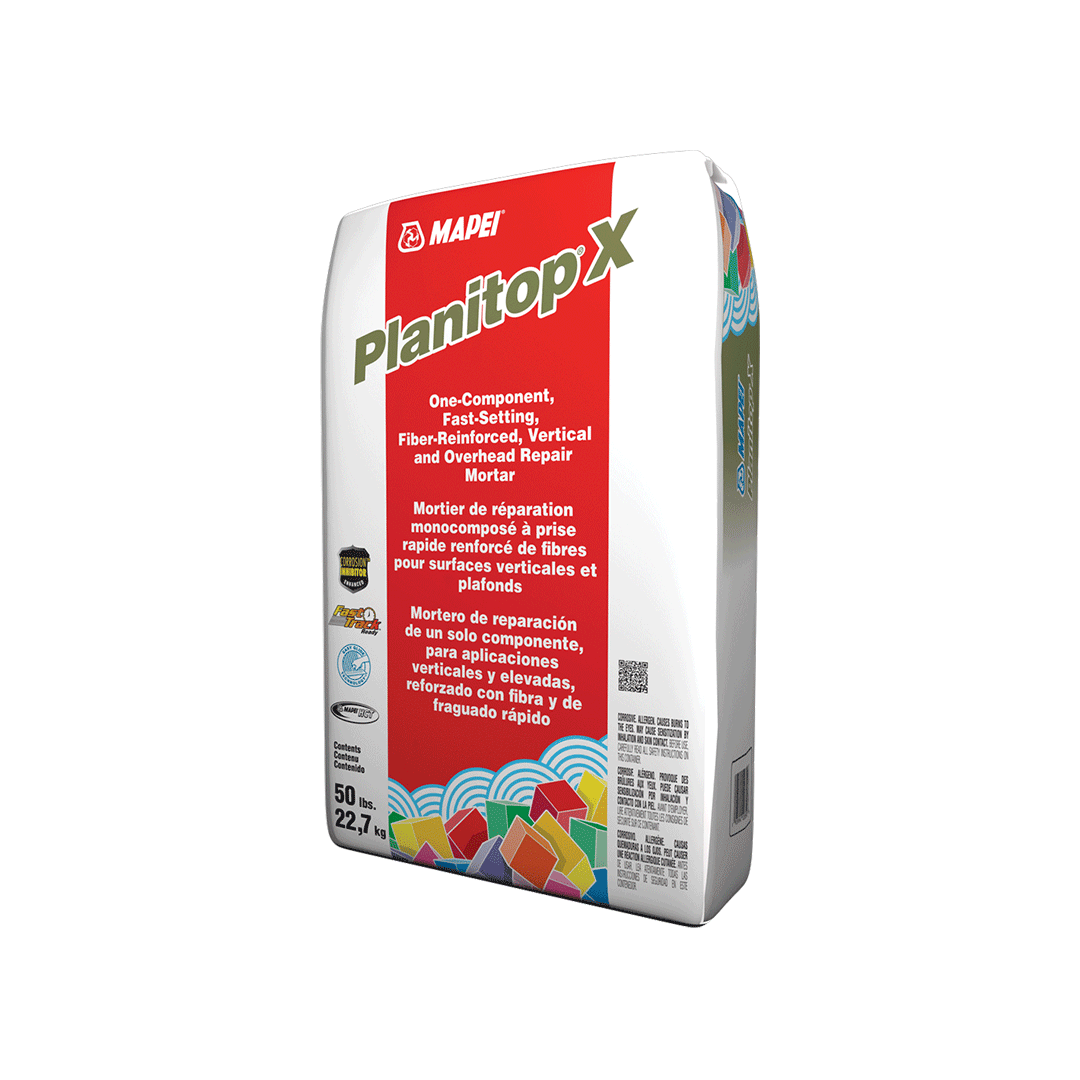Planitop X is a one-component, fiber-reinforced, shrinkage-compensated, high-early-strength, fast-setting, polymer-modified, high-build cementitious repair mortar with a corrosion inhibitor. It is suited for all interior/exterior vertical and overhead concrete repairs, including precast/prestressed, tilt-up, post-tensioned and cast-in-place concrete. Planitop X can be applied from featheredge to 4″ (10 cm) per lift. Planitop X is engineered to provide high early strength with ease of application. Planitop X dries to a light gray color, matching most concrete surfaces.